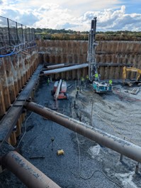 - Implemented sheet piles with one level of tieback anchors into rock; internal bracing used along the south side to avoid conflicts with micropile foundations for the UV Disinfection building.