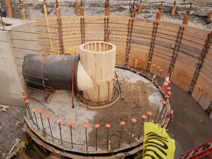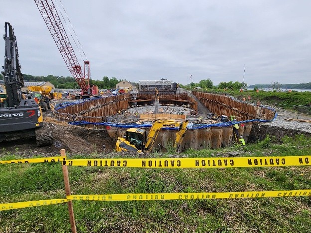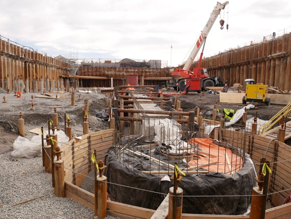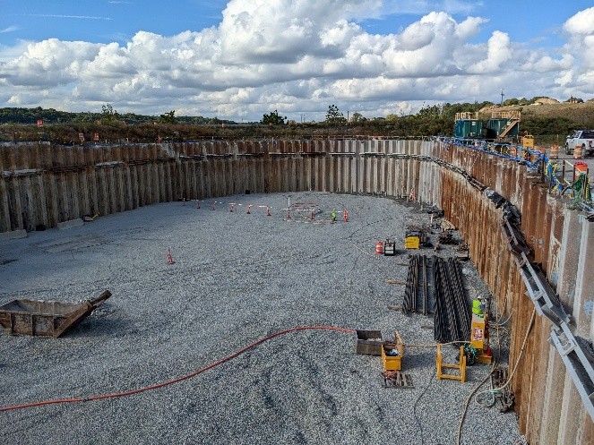 - Addressed challenges including “rocket”-shaped excavation geometry, steeply angled tieback anchors with loads up to 300 kips, variable bedrock, high water/flood events, and equipment access ramps.