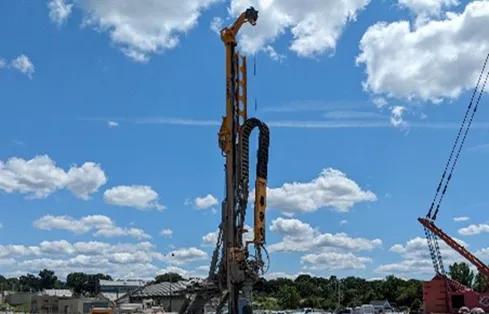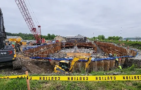 • Addressed challenges including “rocket”-shaped excavation geometry, steeply angled tieback anchors with loads up to 300 kips, variable bedrock, high water/flood events, and equipment access ramps.