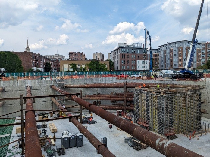 GeoEngineers’ Construction Design team partnered with Trevi Icos Corporation of Charlestown, MA, to provide excavation support design for the 421 Park Drive (Landmark Center) redevelopment in Boston, MA. This 14-story, mixed-use life science project includes laboratory, office, grocery, and parking space. GeoEngineers’ scope included the design of a slurry wall and internally braced support of excavation system.