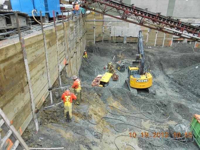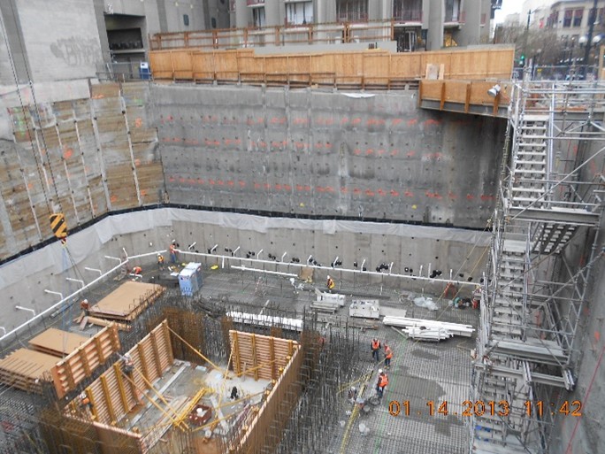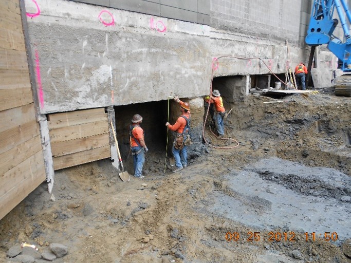 Underpinning soldier piles were installed on either side of the adjacent Seattle Convention Center’s drilled shaft foundations to transfer the drilled shaft loads to the soldier piles, given the excavation extended below the base of the drilled shafts.