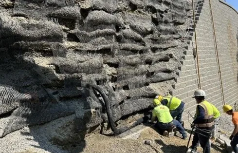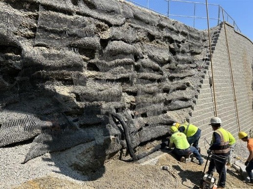 MSE Wall getting a makeover after a flash flood dislodged a few face blocks during construction.