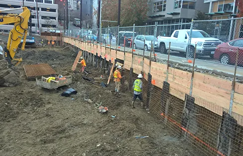 The team used a conventional soldier pile and tieback wall to support excavation on the north side of the site where a large-diameter storm sewer near the excavation required additional shoring support.