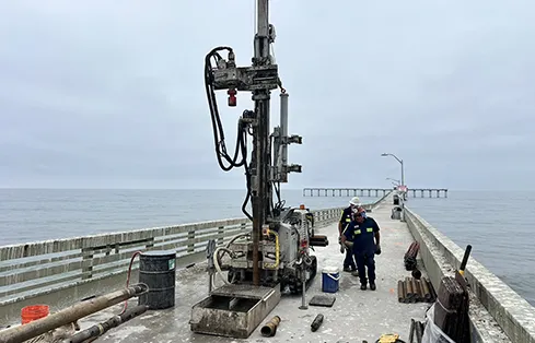 A GeoEngineers team led by Matthew Martinez and Yichi Du provided geotechnical investigation services for the project as a sub-consultant to Moffatt & Nichol Engineers. Although the GeoEngineers team completed initial onshore explorations last year, in addition to geophysical surveying (landside and marine) in May of 2024, they also needed additional offshore geotechnical data—and that meant drilling directly from the deck of the dilapidated pier.