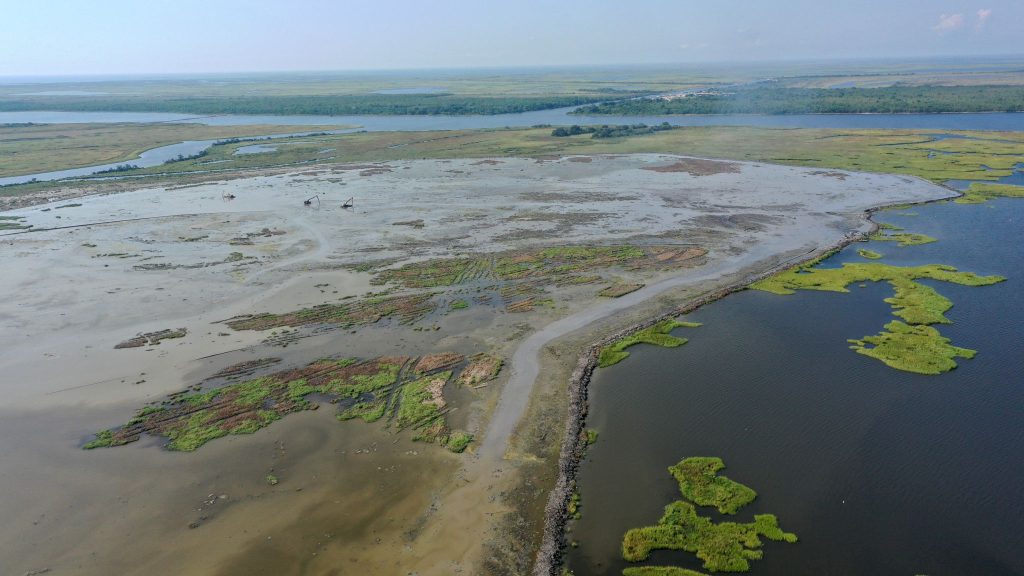 Marsh fill placement was completed in 2025, and the restored landscape is already enhancing the region’s resilience to storms. While newly created marsh may initially appear waterlogged, the dredged material is designed to dry and consolidate over time, forming stable soils capable of supporting robust, vegetated marshland—far more resilient to storm surge than fragmented or degraded marsh systems.