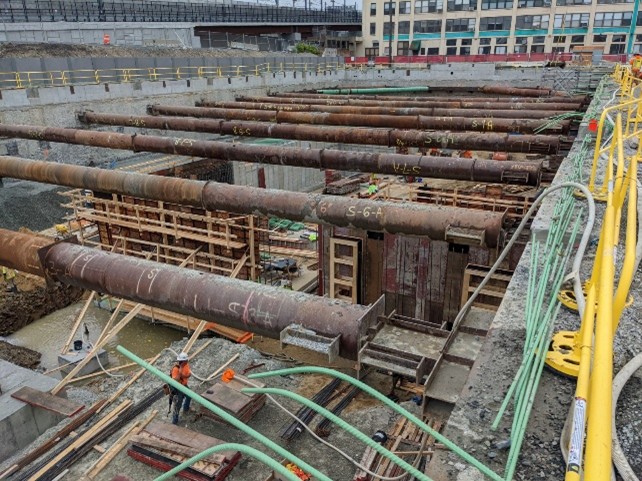 - Implemented a 30-inch-wide slurry wall system with one level of internal bracing; internal wales supported the long sides, and external wales reinforced the short sides and corners.