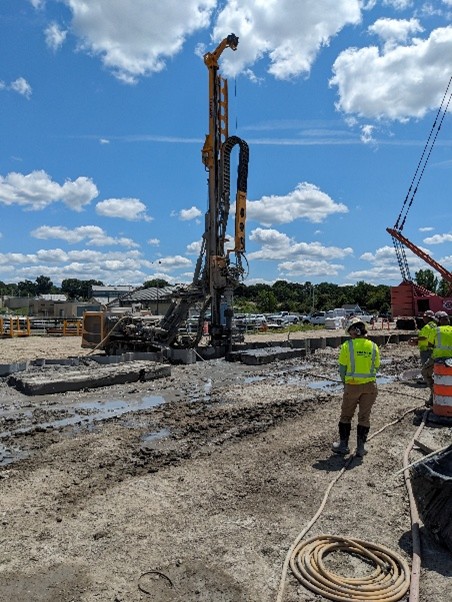 - Addressed challenges including “rocket”-shaped excavation geometry, steeply angled tieback anchors with loads up to 300 kips, variable bedrock, high water/flood events, and equipment access ramps.