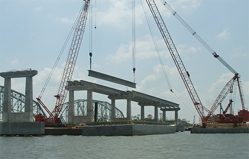 The bridge, which connects eastern New Orleans with southeastern St. Tammany Parish, runs over a very crowded utility corridor that provides major communication and fiber optic cables to New Orleans. This presented a challenge to the GeoEngineers team as they conducted their borings, because the more commonly used floating barge (secured by a series of anchors dropped from the waterline) posed too much risk for damage to the utility cables. GeoEngineers instead used an elevated barge with four static legs, placed carefully around the cables, and deck that raised or lowered as weather permitted.