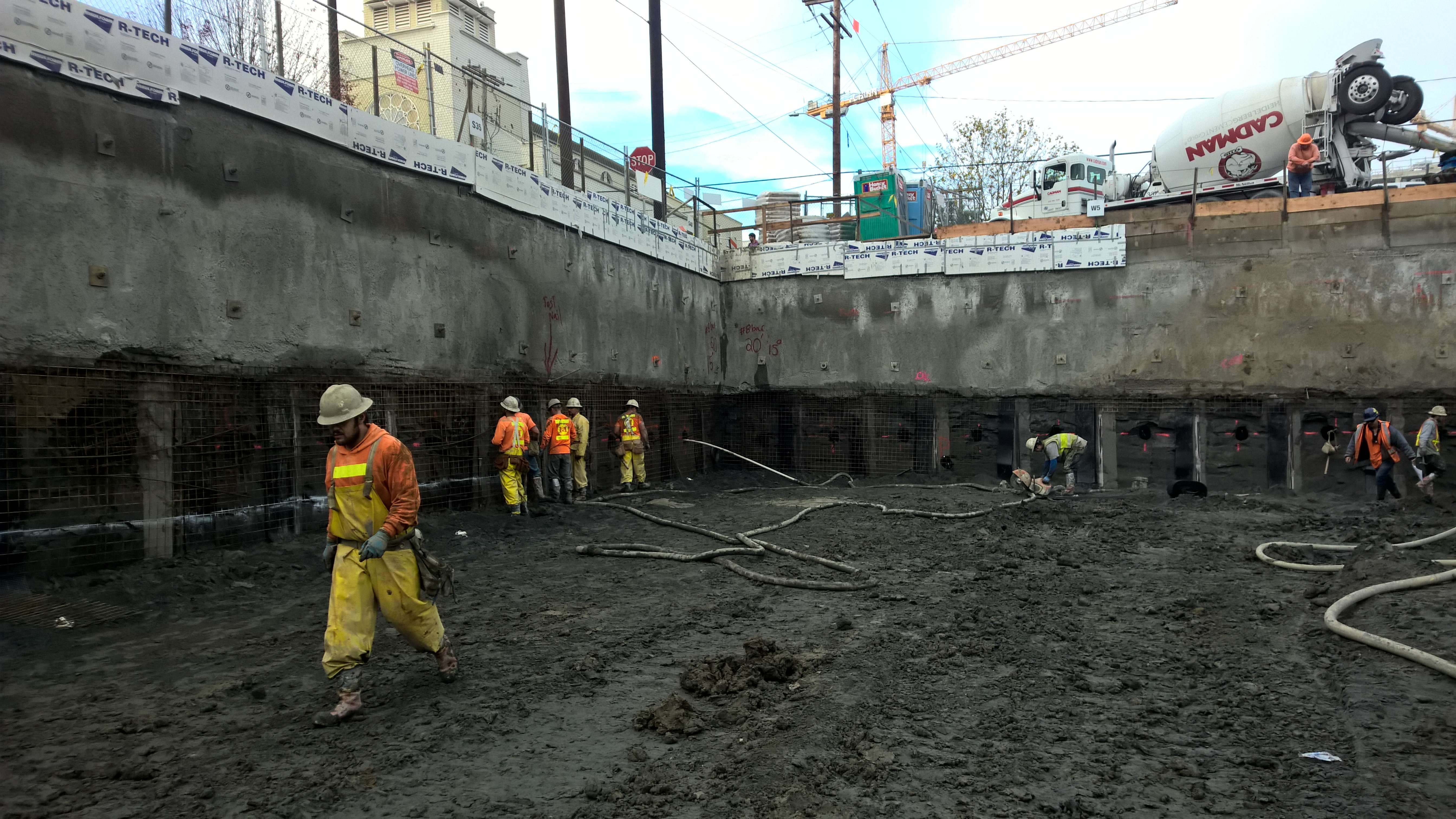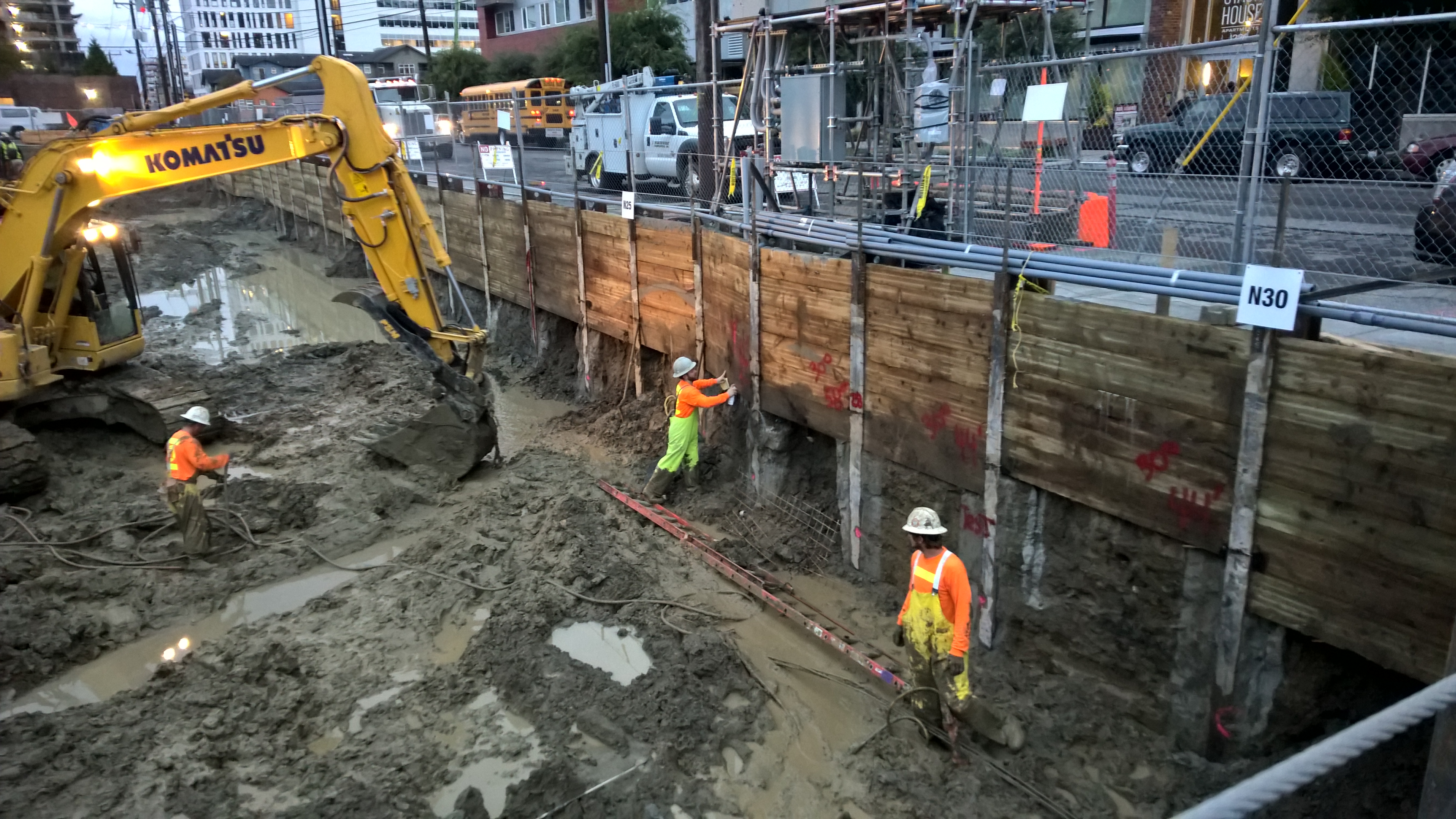 The team used a conventional soldier pile and tieback wall to support excavation on the north side of the site where a large-diameter storm sewer near the excavation required additional shoring support.